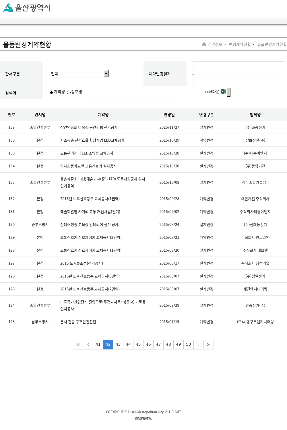 | 131 | 본청 | 예술회관앞 사거리 교통 개선사업(전기) | 2015/09/02 | 계약변경 | 주식회사태경이엔지 |