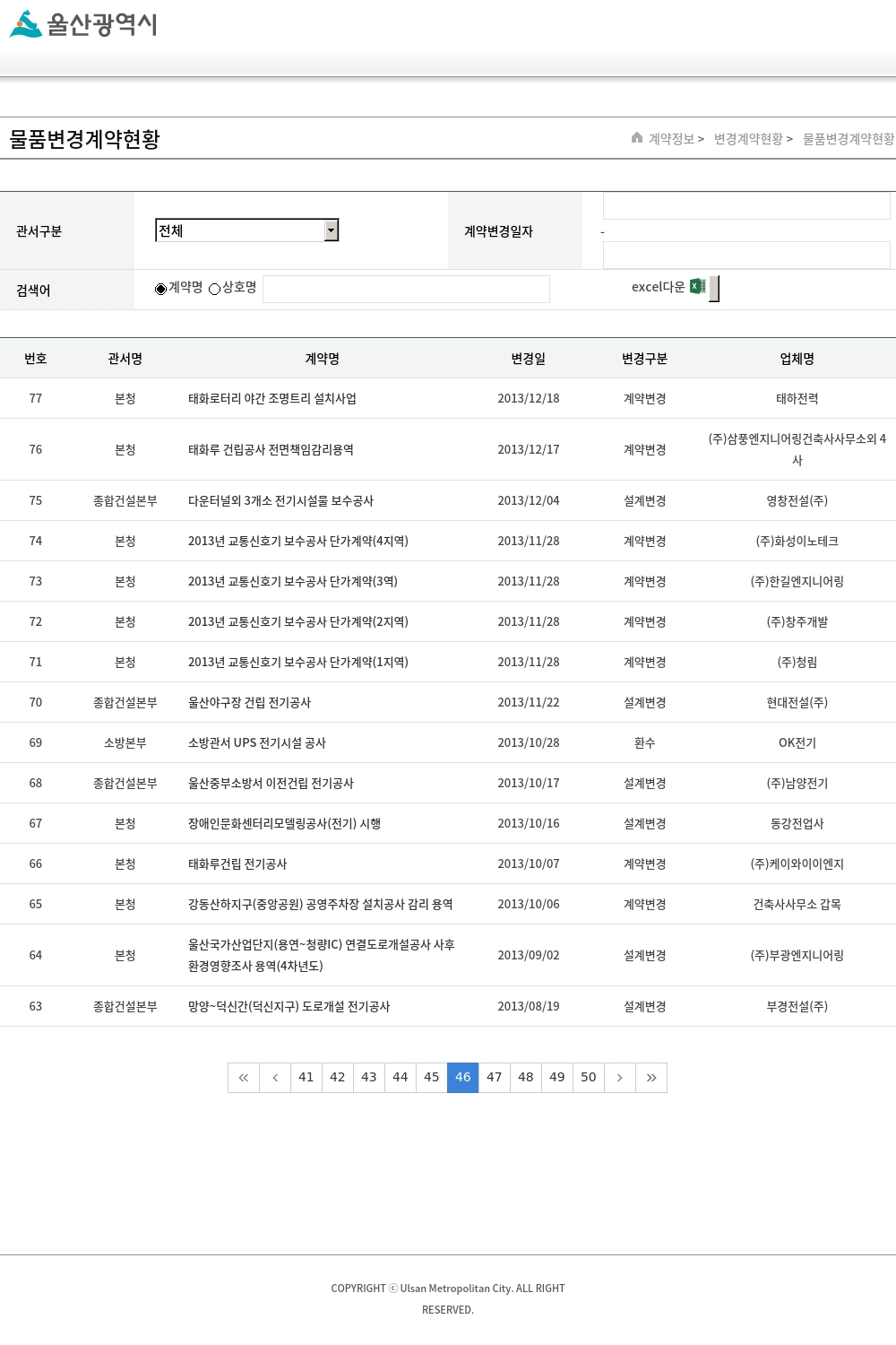 | 77 | 본청 | 태화로터리 야간 조명트리 설치사업 | 2013/12/18 | 계약변경 | 태하전력 |