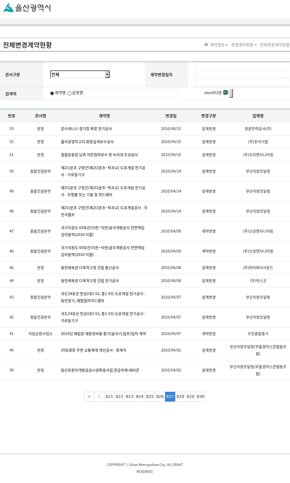 | 113 | 본청 | 29호광장 주변 교통체계 개선공사 관급자재(아스콘) | 2010/05/27 | 계약변경 | 부산지방조달청(부울경아스콘협동조합) |