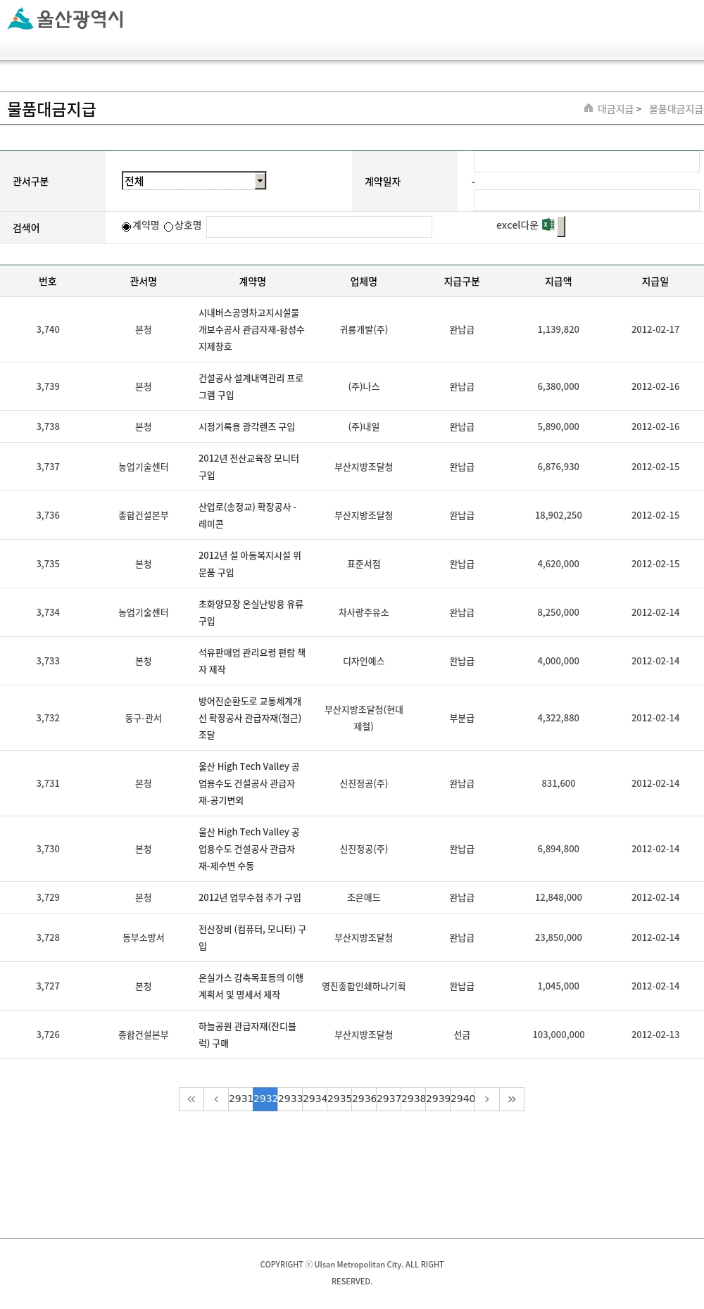 | 3,731 | 본청 | 울산 High Tech Valley 공업용수도 건설공사 관급자재-공기변외 | 신진정공(주) | 완납급 | 831,600 | 2012-02-14 |