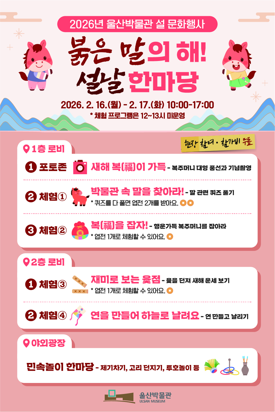 울산박물관은 희망찬 2026년 병오년 새해를 맞아, 온 가족이 함께 즐길 수 있는 「붉은 말의 해! 설날 한마당」을 개최합니다. 박물관 곳곳에서 펼쳐지는 다양한 체험과 민속놀이를 통해 따뜻하고 즐거운 설 연휴 보내시길 바랍니다.