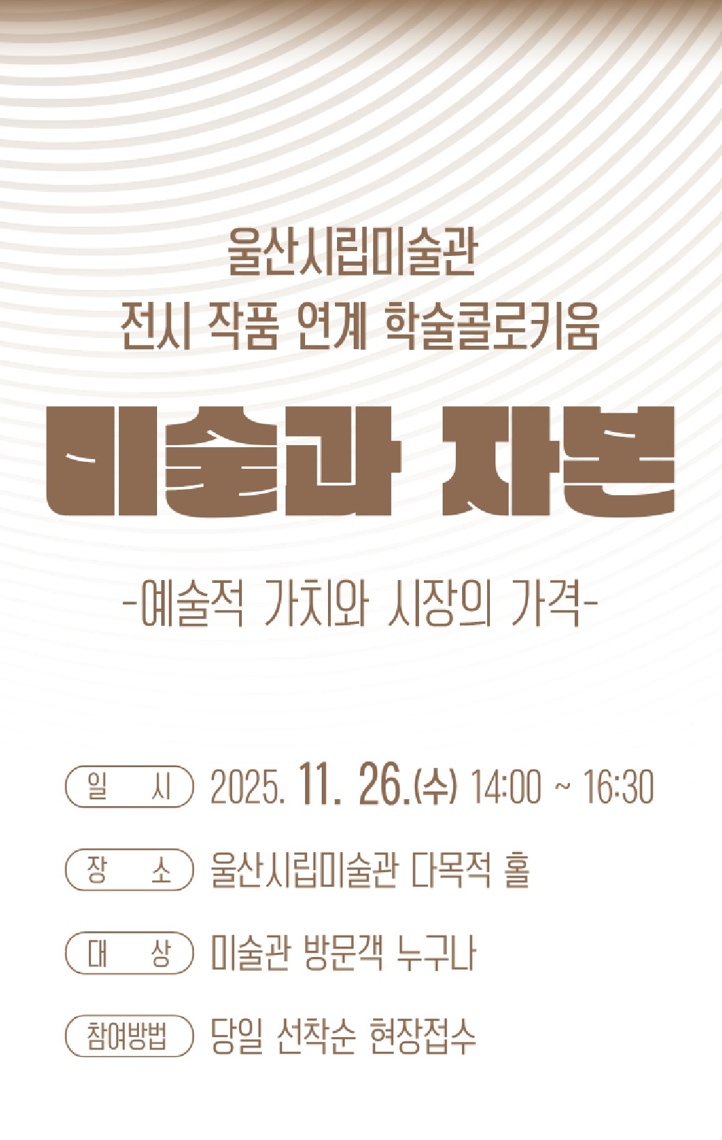 □ 콜로키움 개요 ○ 주 제 : 미술과 자본 : 예술적 가치와 시장의 가격 ○ 일시/장소 : 2025. 11. 26.(수) 14:00~17:00, 울산시립미술관 다목적 홀(B1) ○ 참석대상 : 미술관 방문객 누구나 ○ 내 용 : 주제 발표 및 질의토론 ○ 진 행 진 : 강연자 1명, 모더레이터 1명, 질의자 2명