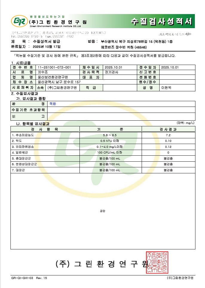 2025년도 보건환경연구원 저수조 수질검사 결과를 붙임과 같이 안내드립니다. 상세보기 2025년도 보건환경연구원 저수조 수질검사 결과를 붙임과 같이 안내드립니다. 작성자 황창호 작성일자 2025.10.20 첨부파일 보건환경연구원 수질검사 성적서.jpg (130.8KByte) 미리보기 미리듣기 2025년도 보건환경연구원 저수조 수질검사 결과를 붙임과 같이 안내드립니다. 목록 인쇄