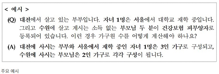 하지만 타 주소지에 등재되어 주민등록표상 세대가 분리되어 있더라도 건강보험 피부양자로 등록된 배우자·자녀는 같은 가구로 구성된다.