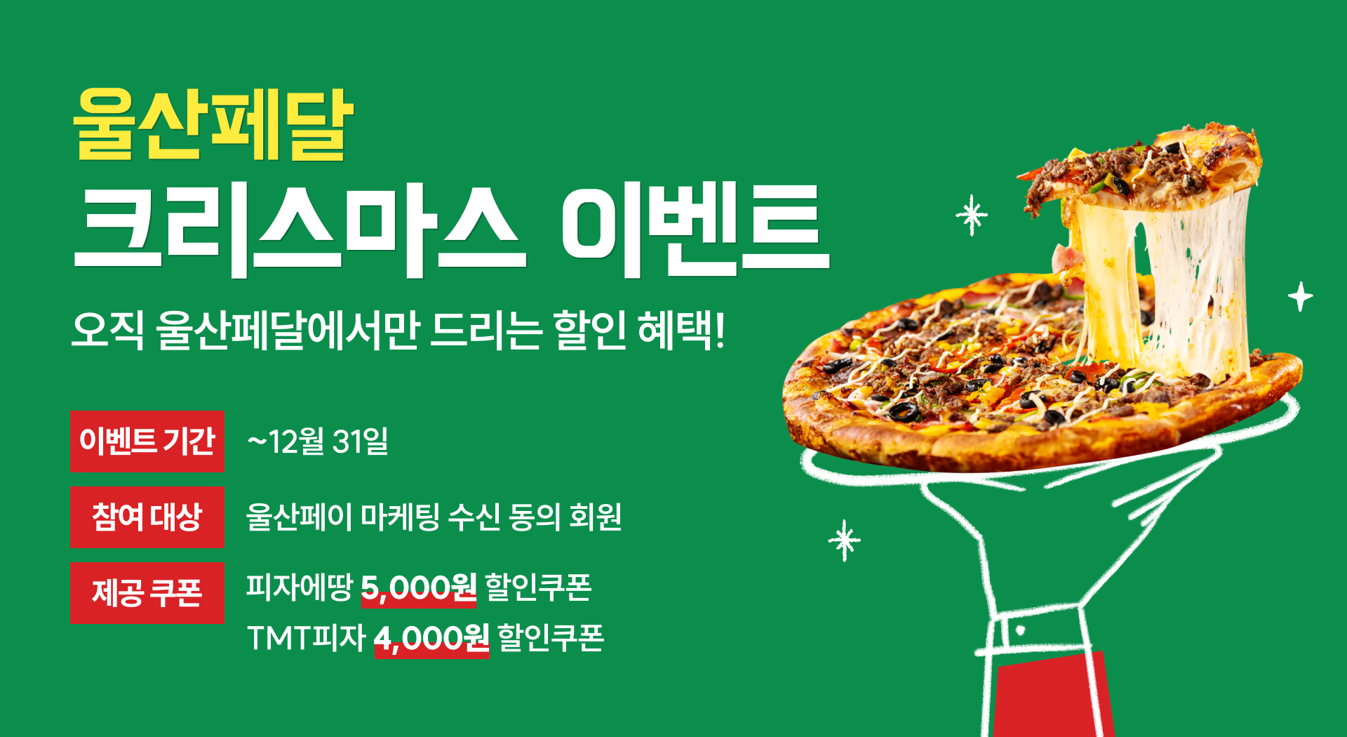(참여대상) 울산페이 마케팅 수신 동의 회원 *울산페이 앱 > 설정 > 마케팅 알림 > 정보 수신 동의(제공쿠폰) 피자에땅 5,000원 할인쿠폰, TMT피자 4,000원 할인쿠폰(발급방법) 울산페이 앱 > 울산페달 바로가기 > 쿠폰 안내창 클릭, 할인쿠폰 내려받기울산페달 이용하면 추가 5% 울산페이 캐시백 혜택이 있어요!!할인쿠폰에 최대 18% 울산페이 캐시백까지,울산페달과 함께 달콤한 연말 보내세요!
