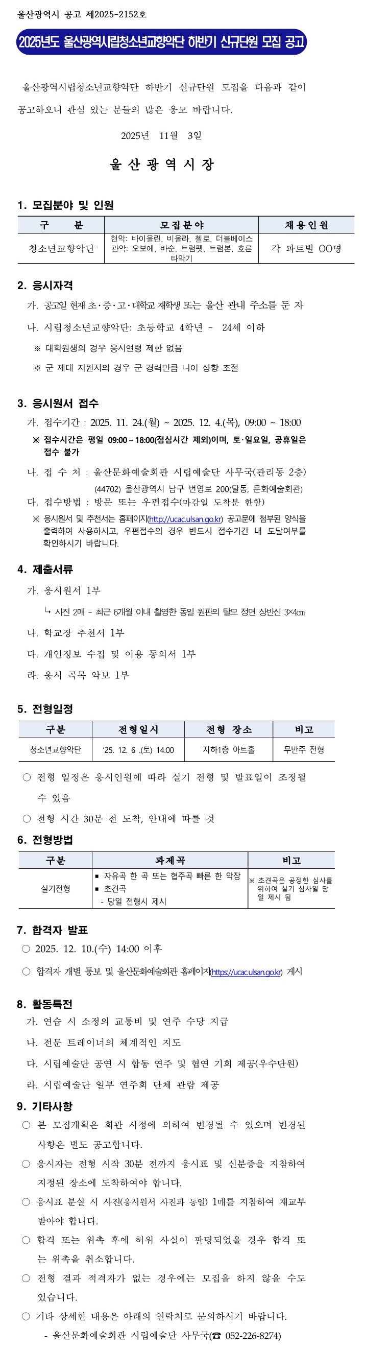 2025년도 하반기 울산광역시립청소년교향악단 신규 단원 모집 공고